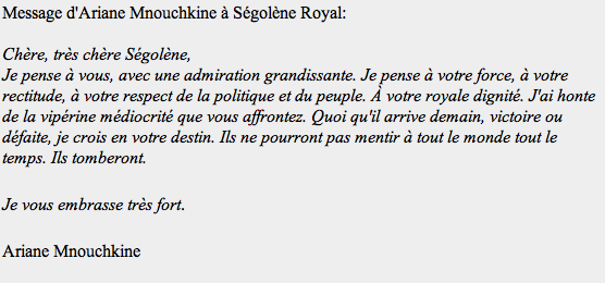 Au bout de cela, et après toutes ces années de chausse-trappe, il y a enfin une reconnaissance quasi unanime de ses « camarades « , sincère ou pas, elle existe et s’exprime en tous les cas. La nomination de tous ses soutiens fidèles dans les charges de l’Etat. Un « aveu », enfin, de toutes les embûches et les résistances à son existence et à sa réussite politiques: Jean-Claude-Peyrolle parle d’une « tentative de meurtre politique » advenue pendant ces élections… »Celle qui, lors de la campagne électorale de 2007, avait réussi à faire bouger les lignes entre la droite et la gauche sur un certain nombre de problèmes de société a été également éliminée de la cohorte de députés socialistes qui va entrer au Palais Bourbon ».
